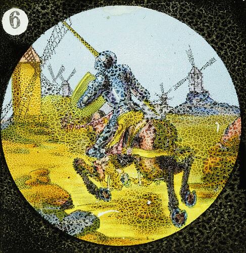 Slide number 6 from a set of 12 lantern slides depicting the story of Don Quixote. Depicts Don Quixote attacking windmills, which he believes to be giants.