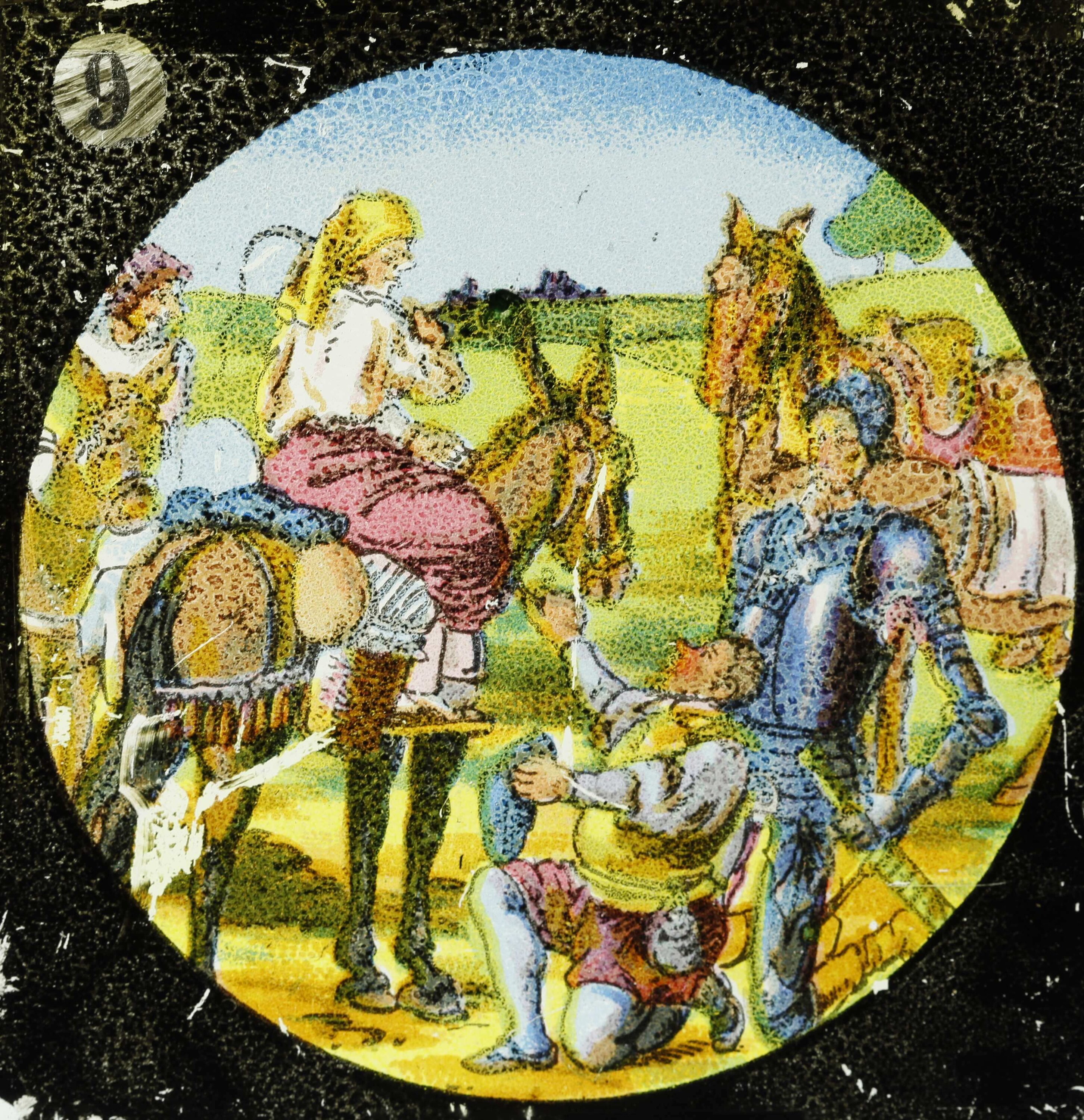 Slide number 9 from a set of 12 lantern slides depicting the story of Don Quixote. Depicts Don Quixote and several other characters.