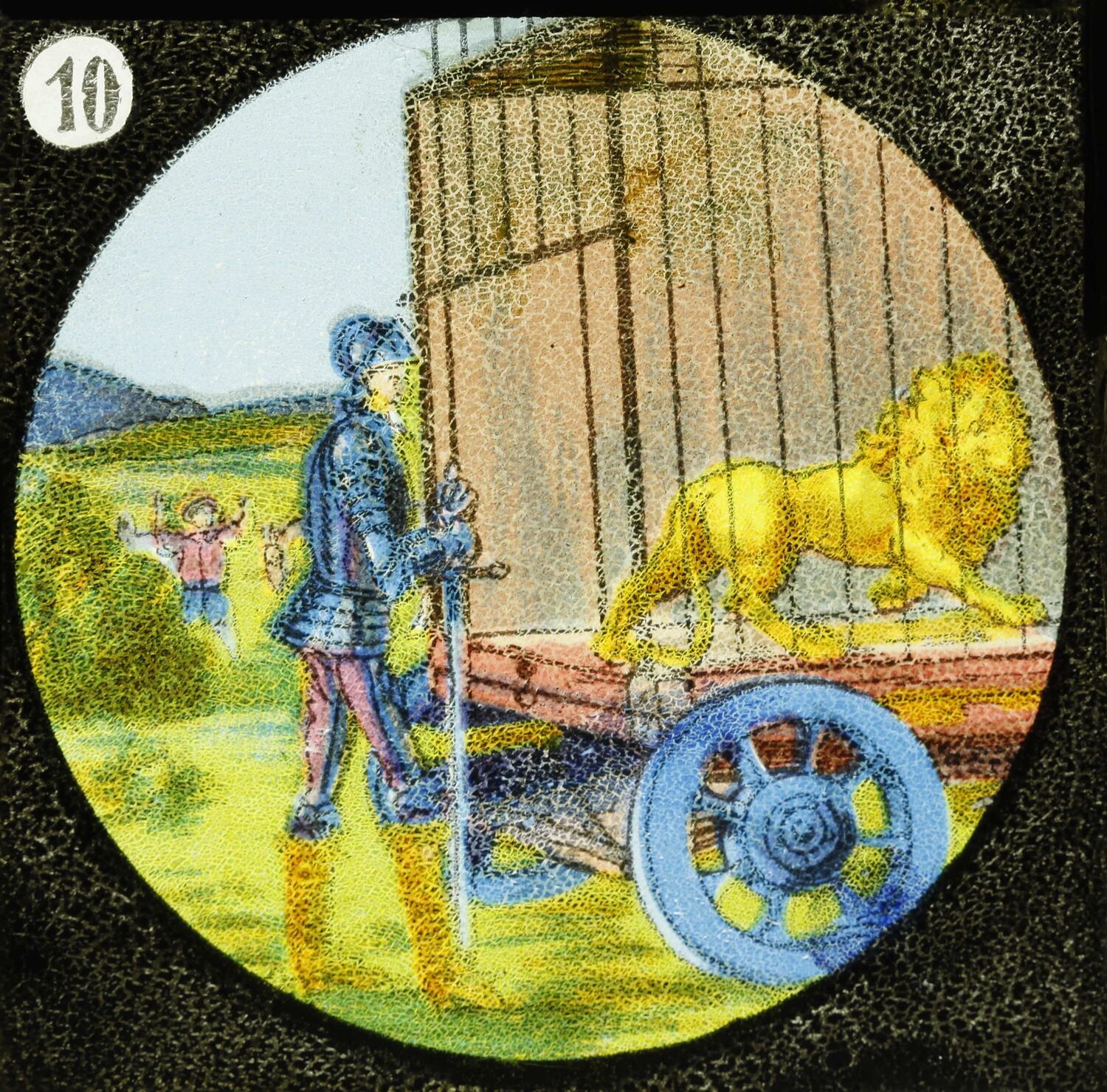 Lantern slide showing a man in armour leaning a long sword pointed to the ground. He looks a a wheeled cage containing a lion. Part of the cage is missing. A boy with arms raised is pictured in the background. Rural scenery appears in background.