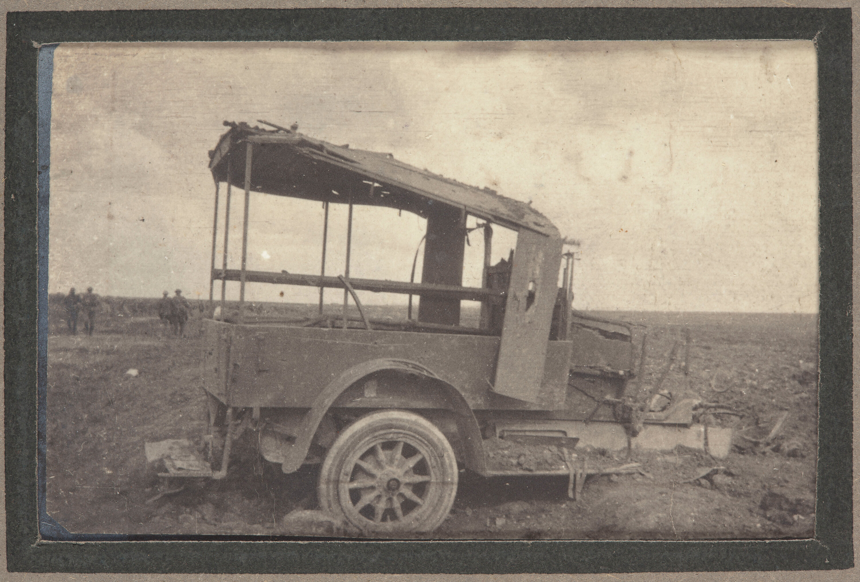 Black and white photographic print which depicts the destroyed shell of a German ambulance on the battlefield at Pozieres.Over six weeks in July and August of 1916, 23,000 Australian soldiers became casualties in the Battle for Pozieres. The German forces relentlessly attacked the Australian soldiers across the 1km wide battlefield at Pozieres to inflict as much damage as possible on the Allied troops and limit vital supplies coming into the village. The fighting at Pozieres finished when the Allied forces claimed the plateau north and east of the village. The Battle of Pozieres is today remembered, in the words of official war journalist Charles Bean as being "more densely sown with Australian sacrifice than any other place on earth".