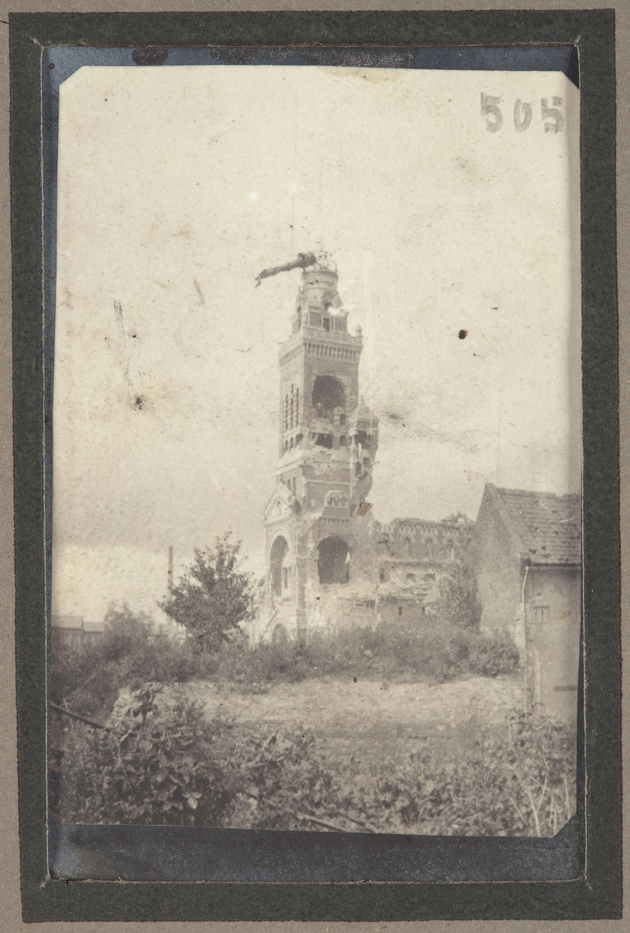 Black and white photographic print which depicts the partially destroyed Basilica of Note-Dame de Brebieres in Albert. In January 1915 the statue positioned on top of the Basilica of the Virgin Mary and her child, also known as the 'Golden Virgin', was hit by a German shell. The statue did not fall off the steeple at this point but remained hanging at a right angle up until the almost complete demolition of the building in April 1918. A number of legends developed amongst the thousands of soldiers who passed through Albert around the 'Leaning Virgin' including the myth that whichever side caused the statue to fall, would lose the war. The German army recaptured the town of Albert in March 1918. To prevent the Germans from using the Basilica as an observation post the British Army bombarded it with artillery where upon the statue finally fell. The remains of the statue were irrecoverable amongst the debris.