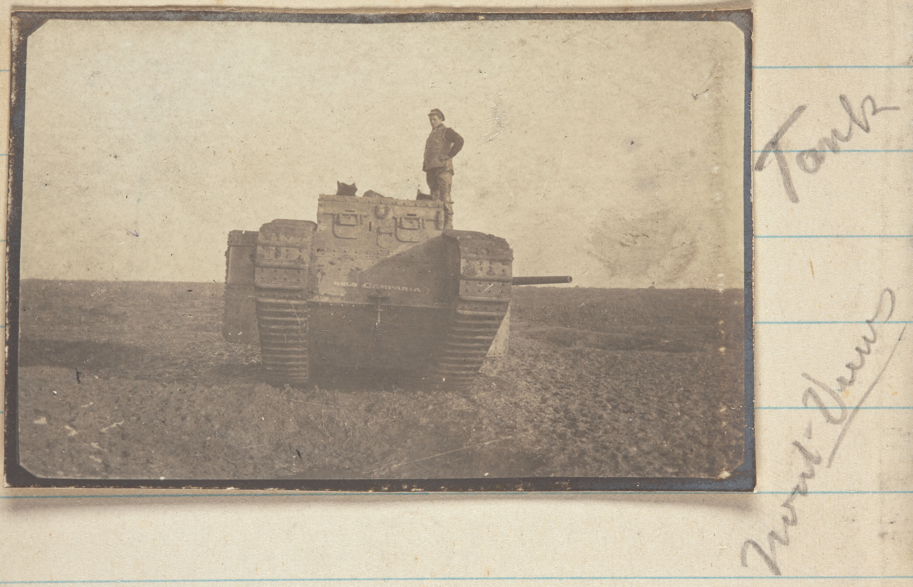 The tank 'HMLS Campania' is mentioned in the diary of Sergt. Barwick, A.A. C. Coy 1st Battalion on 23 February 1917: '...went up & had a look at the Tank they had just fetched along, you would be surprised to see where these monsters can go, this one came down a steep slippery hill, crossed a muddy gulley & climbed the opposite side taking all the old trenches & holes in her track, the name of this Tank by a curious co-incidence was "H.M.L.S Campania". (Mitchell Library collection)