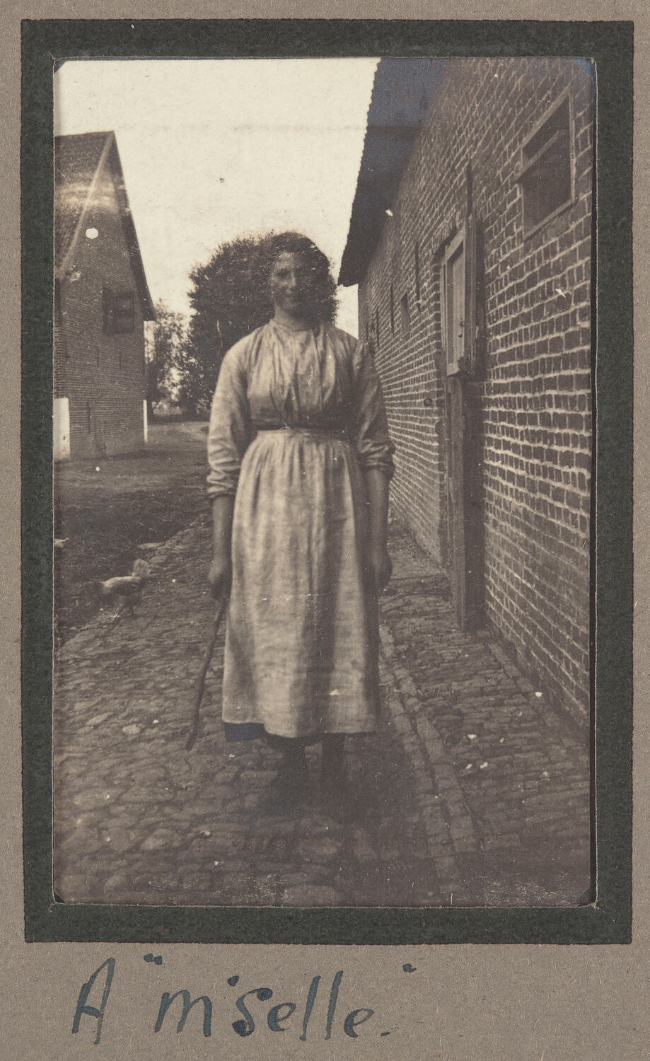 The photograph focuses on a French woman, in every day clothing, standing on a cobble stoned street. Brick buildings are visible to the right and left of the woman. There is also a chicken walking on the road behind the woman, suggesting the location is a farm house.