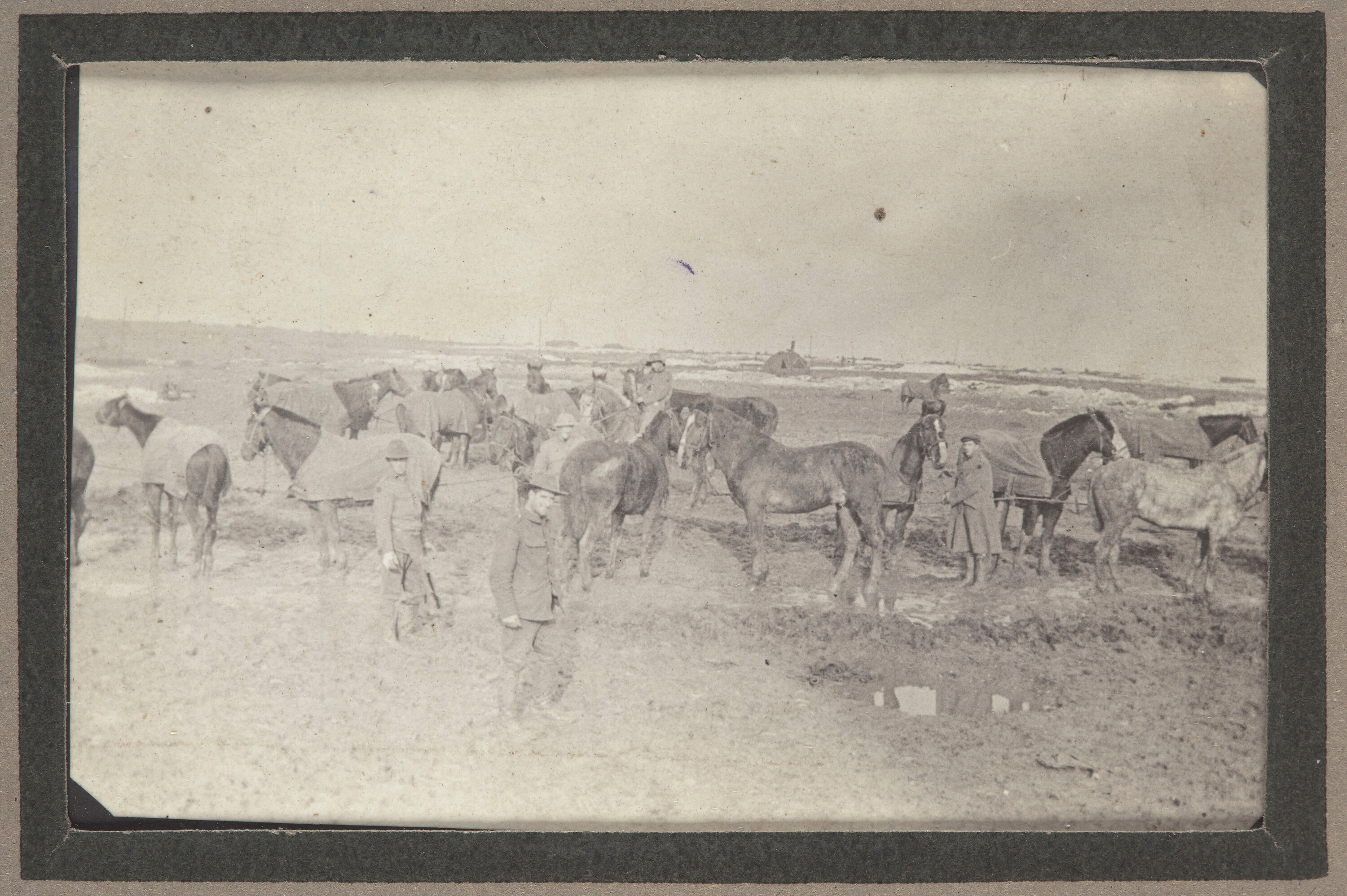 The photograph shows a group of five men standing stationary in a muddy field with a group of un-saddled horses. Most of the horses are wearing blankets and are tethered to a makeshift rope fence. The men appear to be attending the horses. In the background a small tent in the middle of the field is visible.
