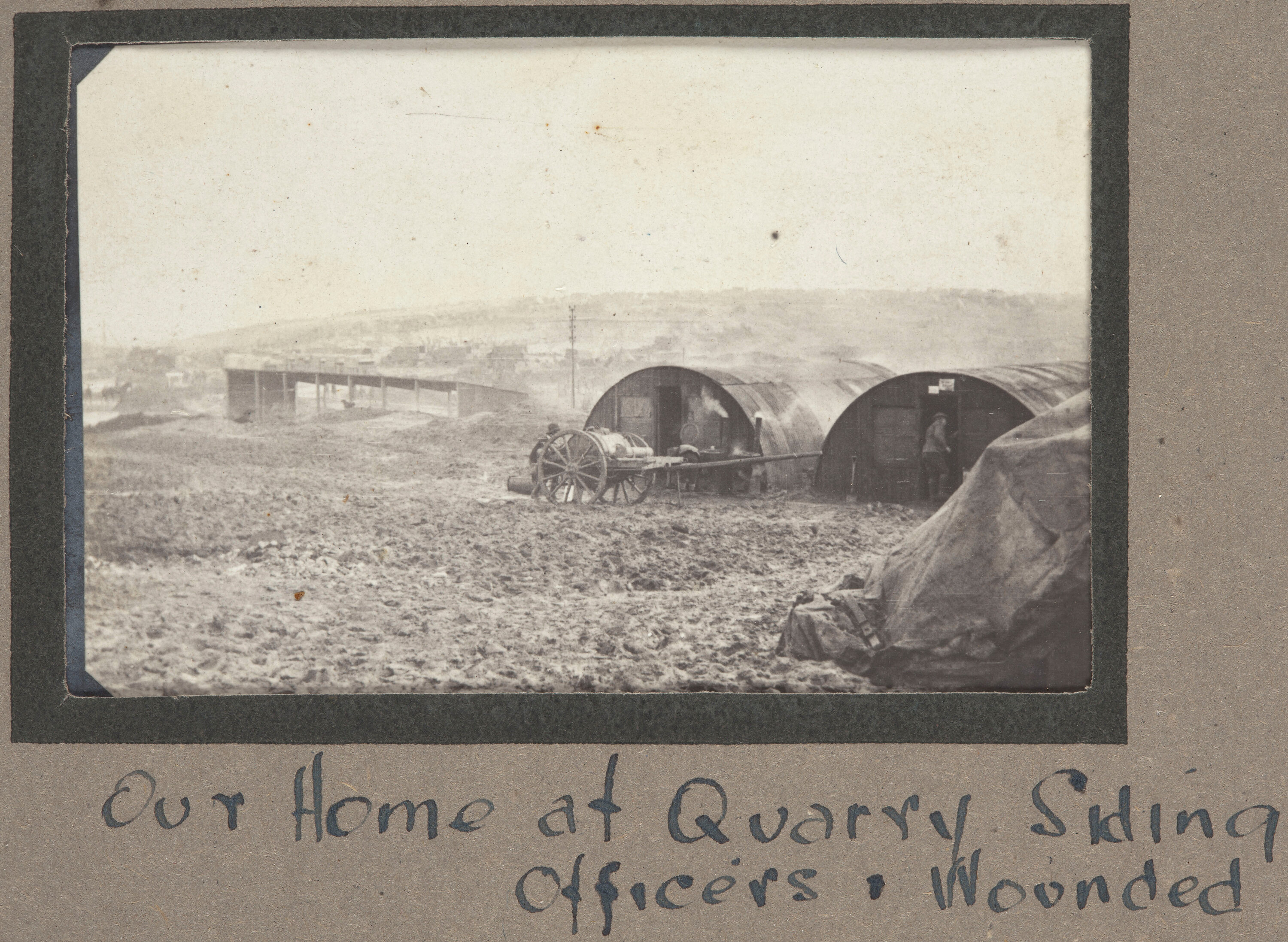 Hand written in ink on matt directly beneath photograph: 'Our Home at Quarry Siding - / Officers & Wounded'