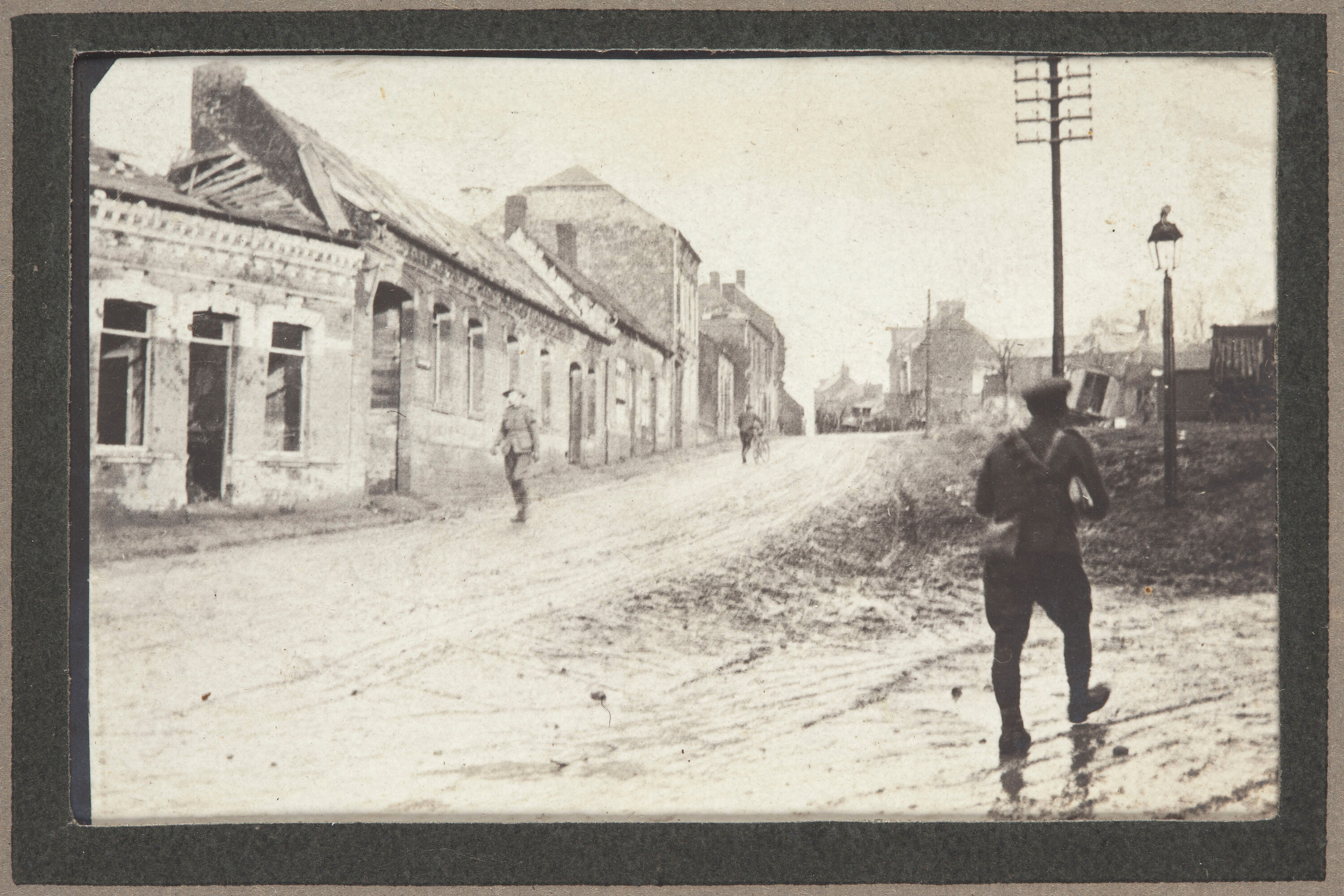The photograph depicts a streetscape in Albert. The house along the roadside, closest in the foreground, has been partially destroyed with the roof mostly missing. Three men can be seen walking along the road, one of which is in uniform. In the background other houses which have experienced less damage are visible.