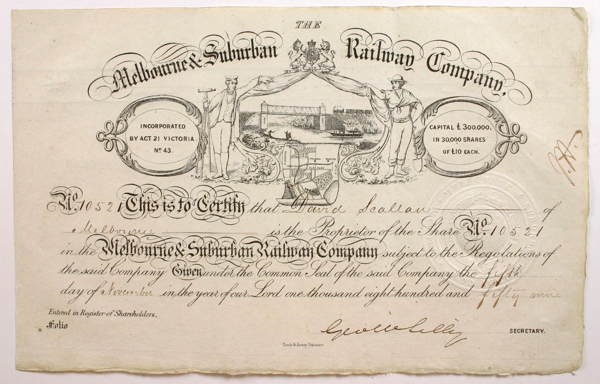 Share Scrip for the Melbourne & Suburban Railway Company, issued to David Scallan of Melbourne, 5th November 1859. The Melbourne & Suburban Railway Company was incorporated by Act 21, Victoria, No.43, with a nominal capital £300,000 in 30,000 shares of £10 each. Share No.10521. Signed by Geo. W. Lilly, Secretary. Printed by Sands & Kenny, Stationers.