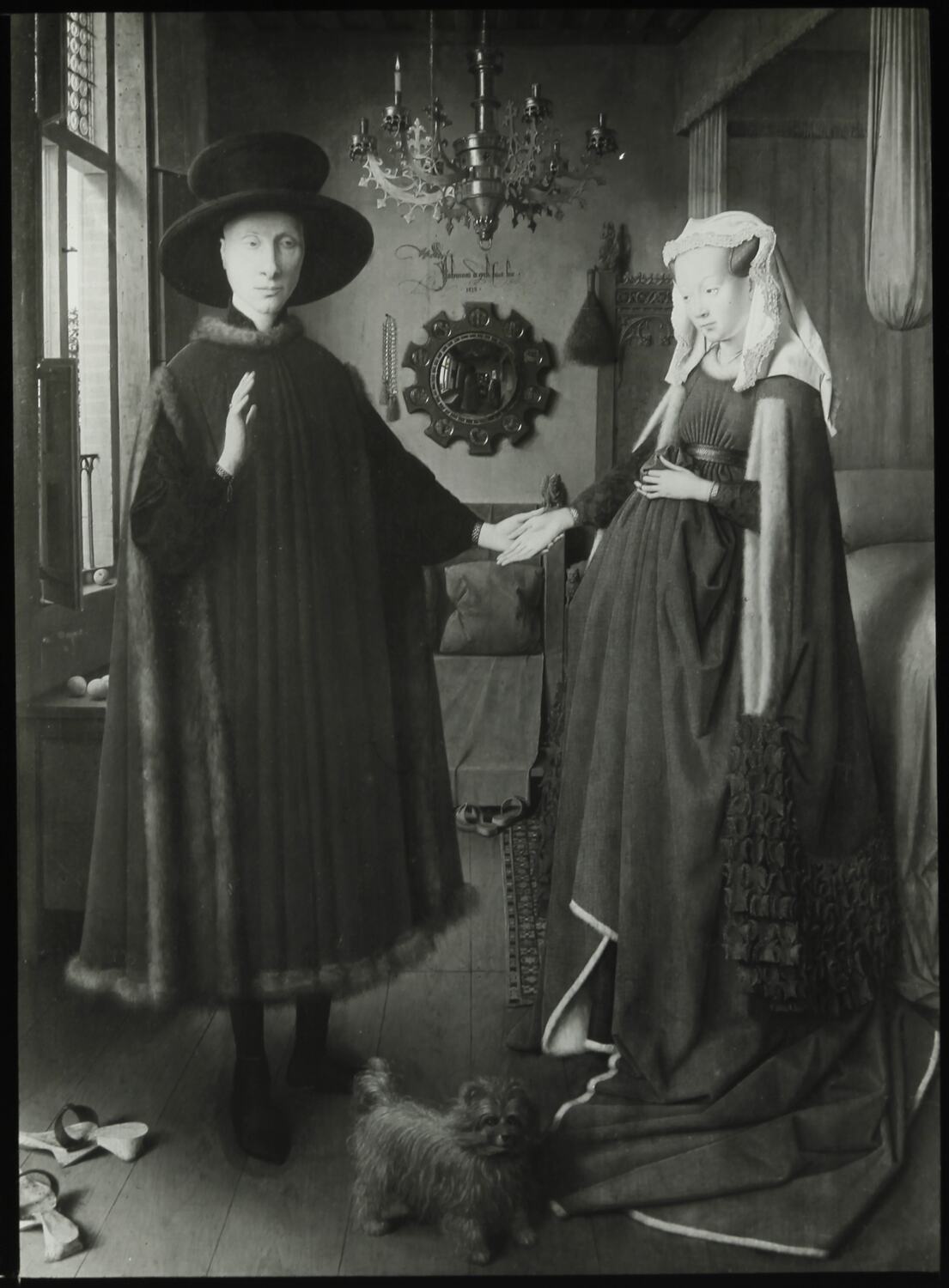 Portrait in oil of Italian merchant Giovanni Arnolfini and his pregnant wife in a bedroom.