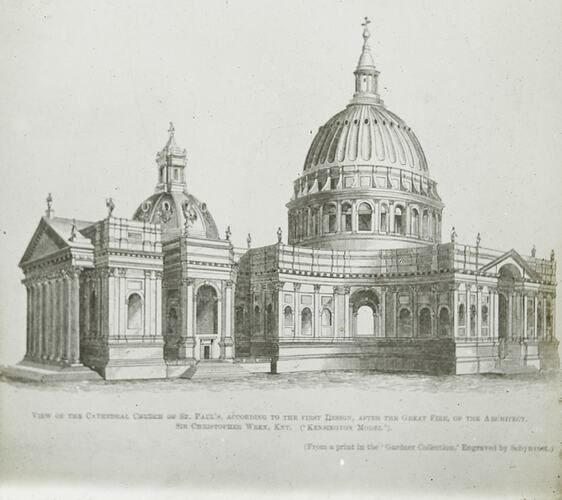Hand written in blue ink on a cream label attached to slide: '1113' Printed in grey ink on glass slide: 'VIEW OF THE CATHEDRAL CHURCH OF ST. PAUL'S, ACCORDING TO THE FIRST DESIGN, AFTER THE GREAT FIRE, OF THE ARCHITECT, / SIR CHRISTOPHER WREN, KST. ('KENSINGTON MODEL') / (From a print in the 'Gardner Collection,' Engraved by Schynvoet.)'