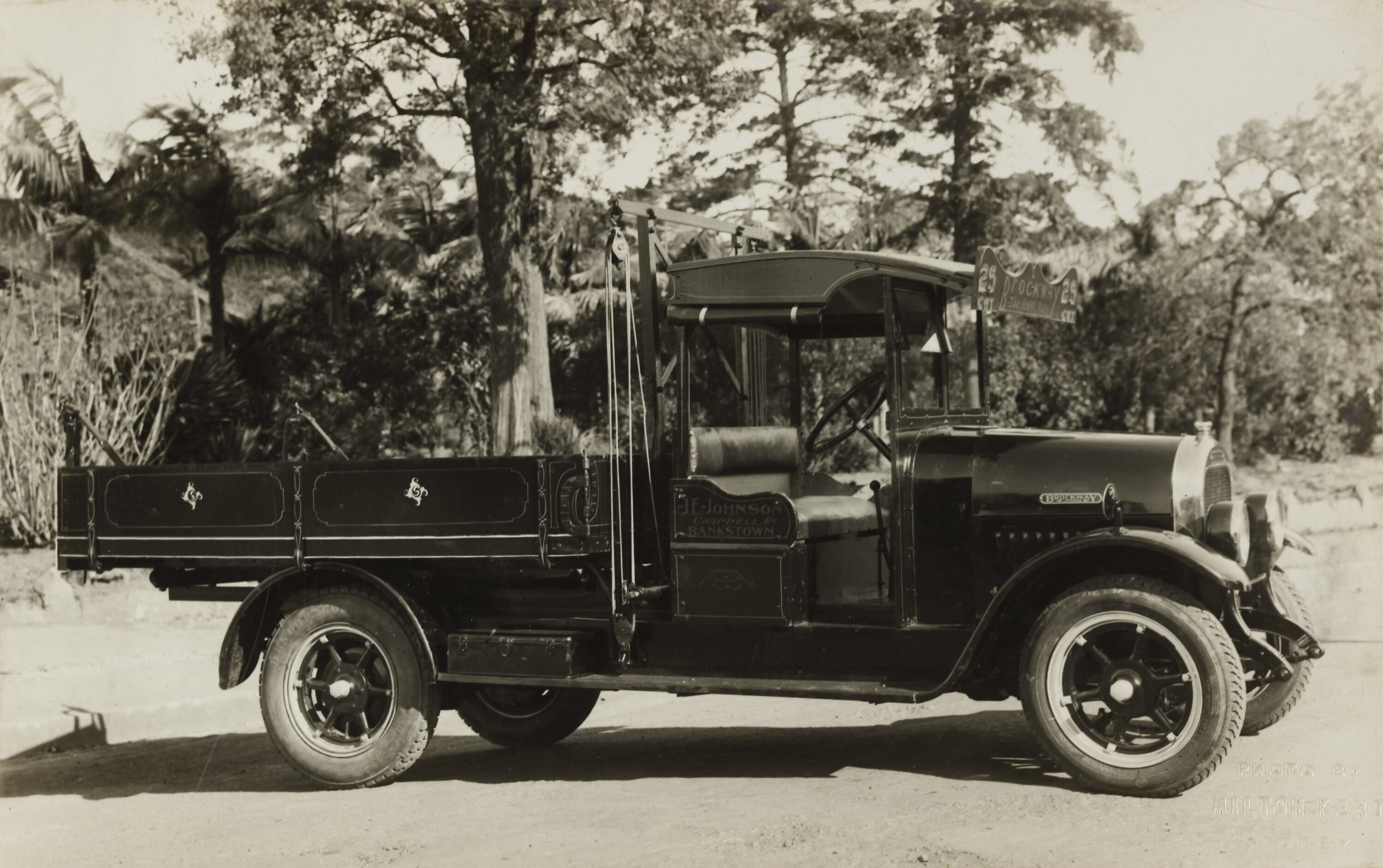 Embossed into photograph: 'PHOTO BY / MILTON KENT / SYDNEY' Typeset in black ink on back of photograph: 'Brockway Junior 25 cwt. with / hand tipping body.' Printed in black ink on back of photograph: 'Science Museum / of Victoria' Hand written in grey pencil on back of photograph: '£397.10 / 69.10 / 65'