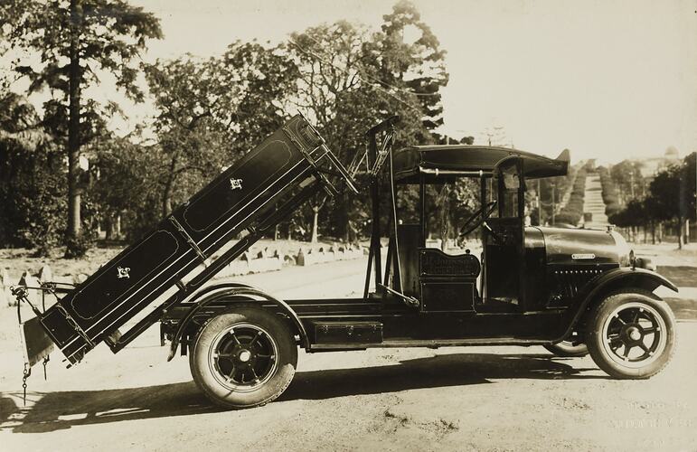 Embossed into photograph: 'PHOTO BY / MILTON KENT / SYDNEY' Typeset in black ink on back of photograph: 'Brockway Junior wtih tipping body.' Printed in black ink on back of photograph: 'Science Museum / of Victoria'