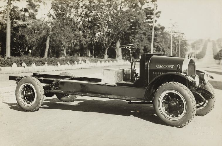 Embossed into photograph: 'PHOTO BY / MILTON KENT / SYDNEY' Typeset in black ink on back of photograph: 'Brockway 35cwt. chassis equipped with / 6" tyres. Spare tyre and tube supplied / as standard equipment in addition to / power tyre pump and Magneto.' Printed in black ink on back of photograph: 'Science Museum / of Victoria' Hand written in grey pencil on back of photograph: '£ 545 Chassis / (5) 37x7 tyres £20 extra'