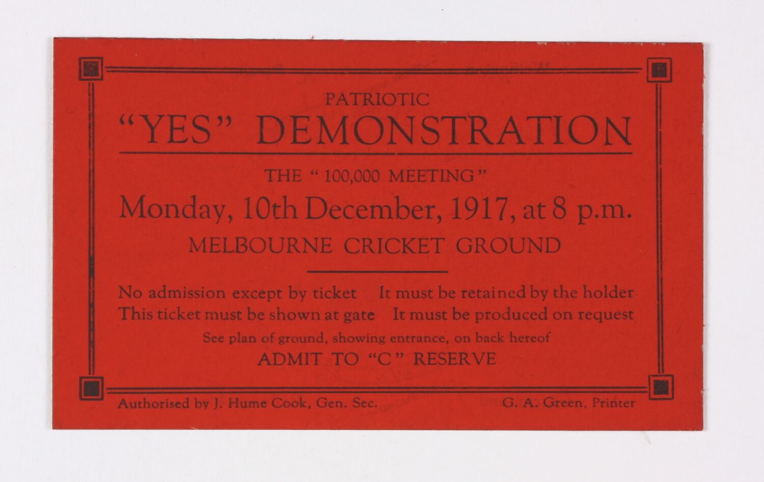 'C' reserve ticket for a pro conscription demonstration held at the Melbourne Cricket Ground (MCG) on Monday 10 December 1917 at 8 pm. Authorised by James Hume Cook, Federation and General Secretary, the ticket was printed by G.A. Green.