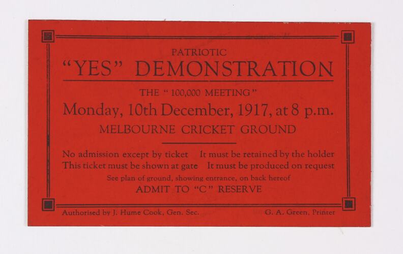 Printed on obverse: PATRIOTIC 'YES' DEMONSTRATION/ THE "100,000 MEETING"/ Monday, 10th December, 1917, at 8 p.m./ MELBOURNE CRICKET GROUND/ No admission except by ticket It must be retained by the holder/ This ticket must be shown at gate It must be produced on request/ See plan of ground, showing entrance, on back hereof/ ADMIT TO "C" RESERVE/ Authorised by J. Hume Cook, Gen. Sec. G.A. Green, Printer