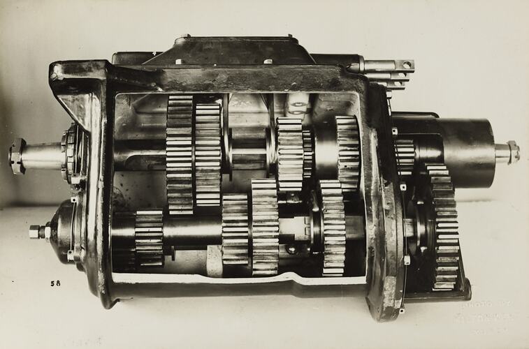 Embossed into photograph: 'PHOTO BY / MILTON KENT / SYDNEY' Typeset in black ink on back of photograph: 'The famous nine speed Gearbox. See / special circular for description.' Printed in black ink on back of photograph: 'Science Museum / of Victoria' Hand written in grey pencil on back of photograph: '(indecipherable)'