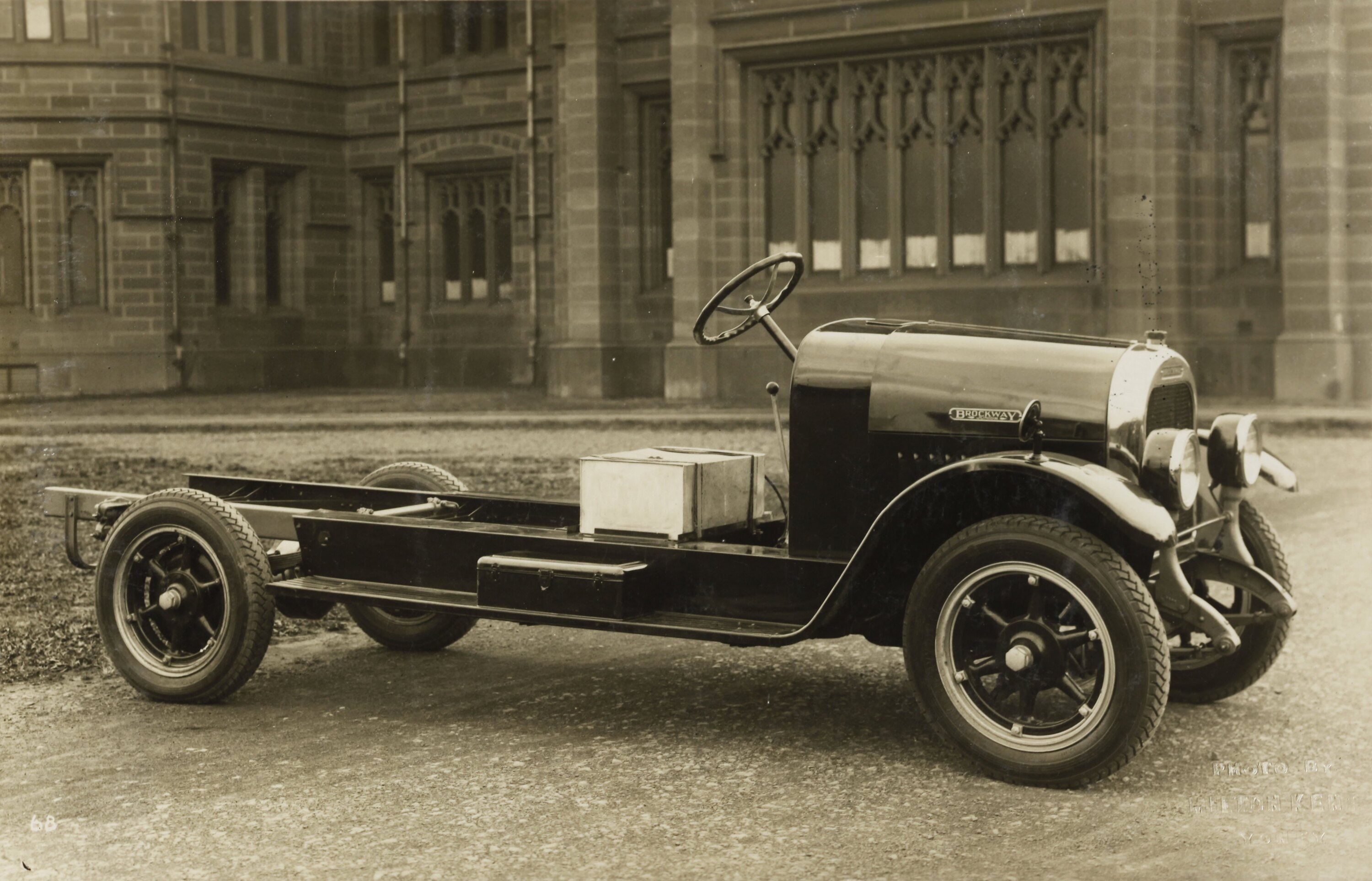 A Brockway Junior truck shown in the foreground. Exterior of a stone building pictured in the background, possibly Sydney University