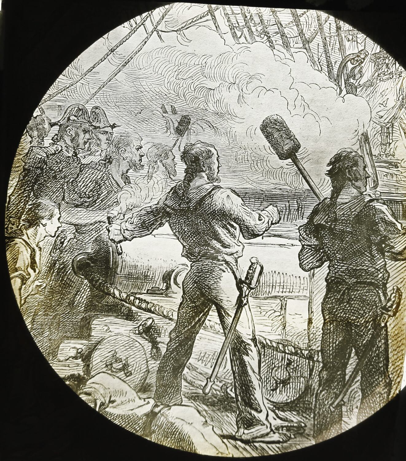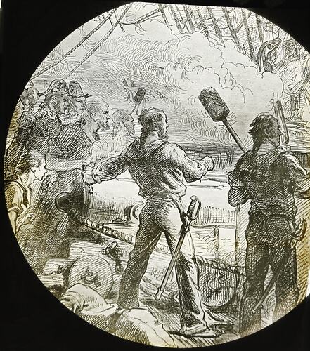 Black and white line drawing showing men in battle. The main figures are dressed in rough clothes with neck scarves or large collars. One is wearing a sword; another bears what appears to be a ramrod for loading cannon. They look towards a scene of smoke and flame, though which a ship's rigging is just visible. To their left are several figures including two men wearing naval bicorn hats.
