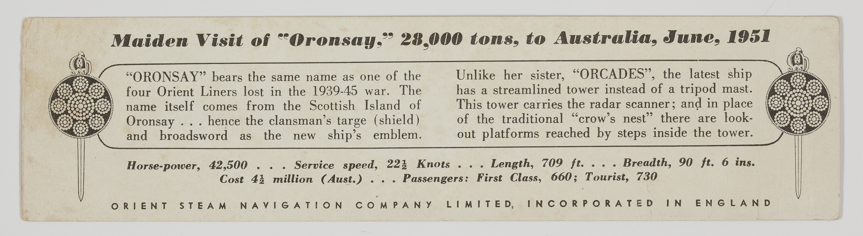 Printed in colour on the front and black ink on the back of a narrow horizontal strip of stiff card. The front features an illustration of the 'Oronsay' under steam showing the ship in its original appearance with distinctive Orient Line livery with a corn coloured hull, green below the waterline, white superstructure and single yellow funnel with black top.