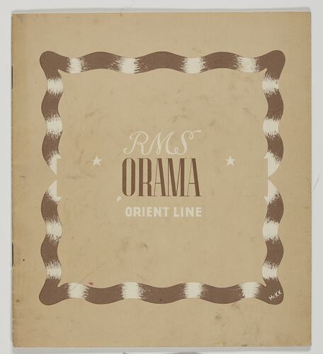 Staple-bound 12 page booklet printed in limited two-colour design on white stock. The front cover is printed in fawn and brown with the title 'RMS ORAMA ORIENT LINE'. Inside pages are printed predominately in black & white with each page featuring a single black & white photograph with accompanying caption and simple black and fawn banners at the top and bottom.