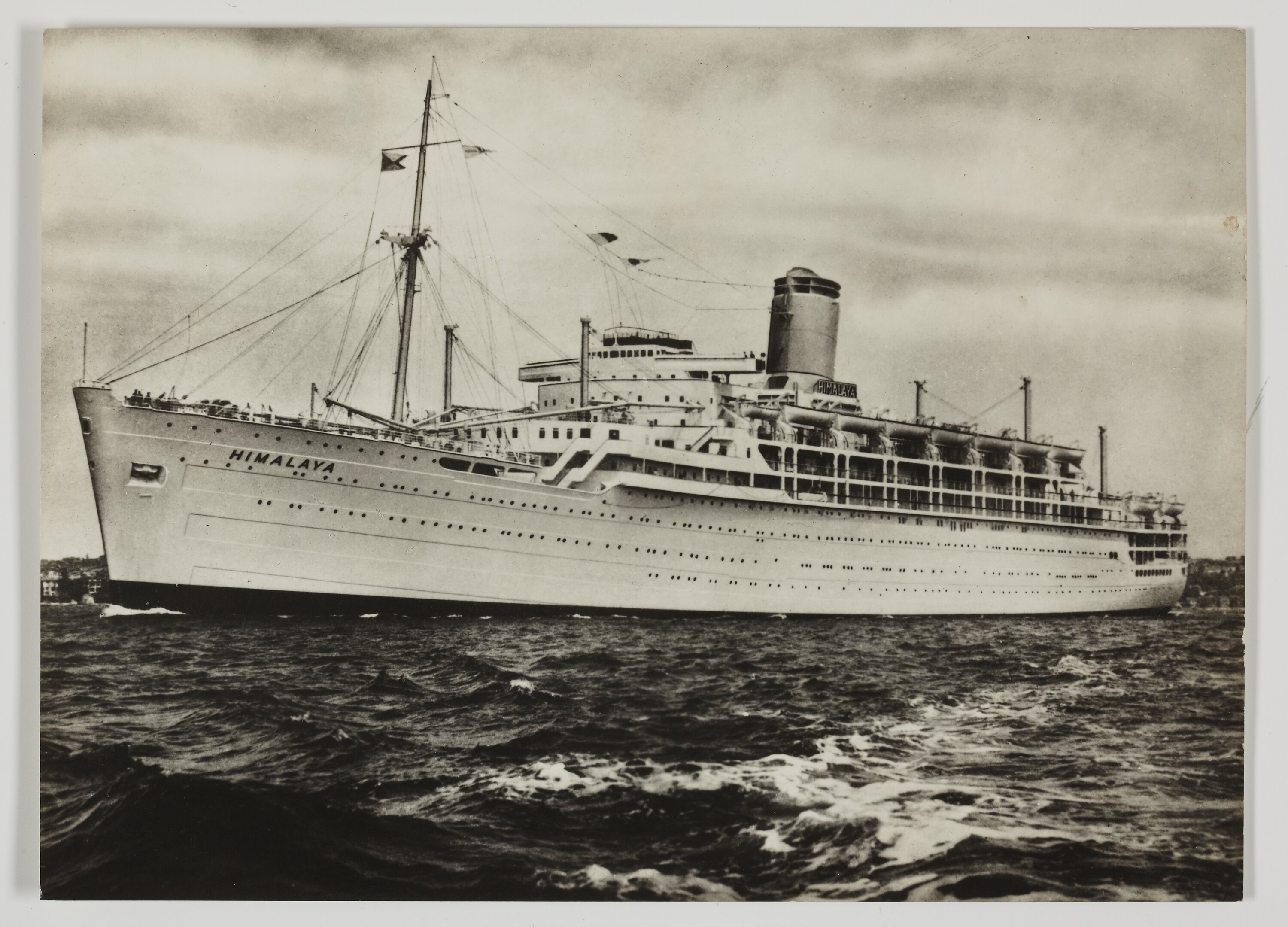 Black & white publicity photograph of the 28,000 ton RMS Himalaya, which operated as a passenger, mail and cargo steamship on the P&O Line's "India and Australia Mail" service between 1949 and 1974.