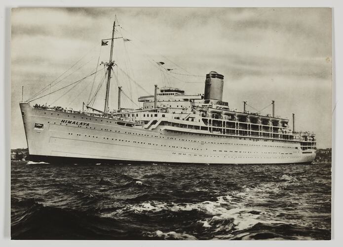 The 'Himalaya' was built at Vickers Armstrong Ltd, Barrow-in-Furness, in north-west England, and launched on the 5th October 1948, departing on her maiden voyage on 6th October 1949. She was the P&O Line's first new passenger liner delivered after World War II and was a contemporary of the Orient Line's 'Orcades', sharing the same basic hull design. During her service 'Himalaya' underwent a number of improvements the first of which was, although controversial at the time, a funnel cowl to keep the liner's decks clear of soot, without interference to the performance of the boilers. Following the sale of the 'Strath' Class liners by P&O, 'Himalaya' was converted to provide accommodation for tourist-class passengers only.