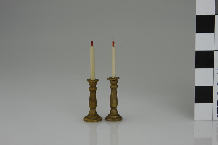 Small, gold painted wood candlestick with white taper candle