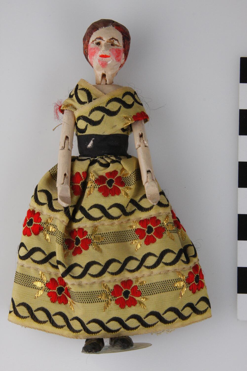 Handmade wooden female doll. Hand painted with articulated joints. Doll is wearing a dark cream dress with red flowers and black striped bands. Black band around waist. Doll is also wearing a petticoat and pantaloons.