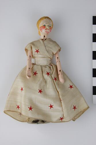Handmade wooden female doll. Hand painted with articulated joints. Doll is wearing a cream dress with red stars. Cream band around waist. Doll is also wearing a petticoat and pantaloons.