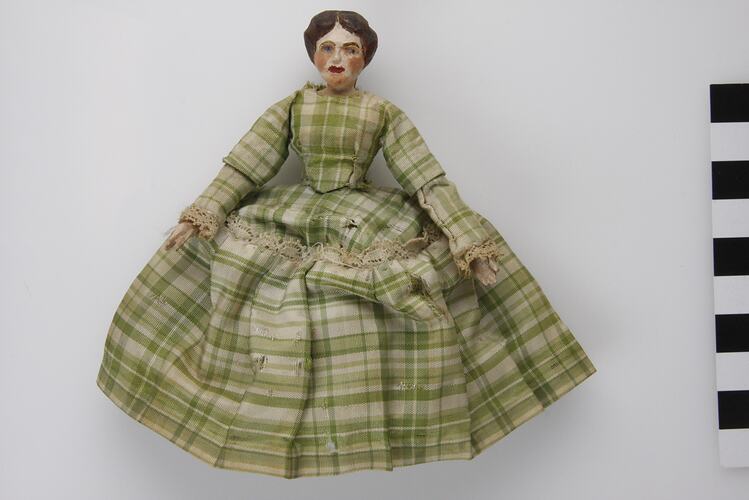 Handmade wooden female doll. Hand painted with articulated joints. Doll is wearing a green and cream check dress. Doll is also wearing a petticoat and pantaloons.