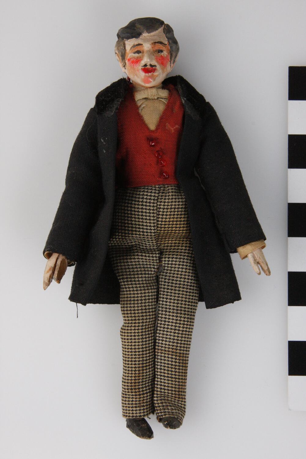 Handmade wooden male doll. Hand painted with articulated joints. Doll is wearing a black jacket over a maroon waistcoat and cream shirt with matching bow tie. He is wearing black and cream plaid trousers. The man has a moustache.