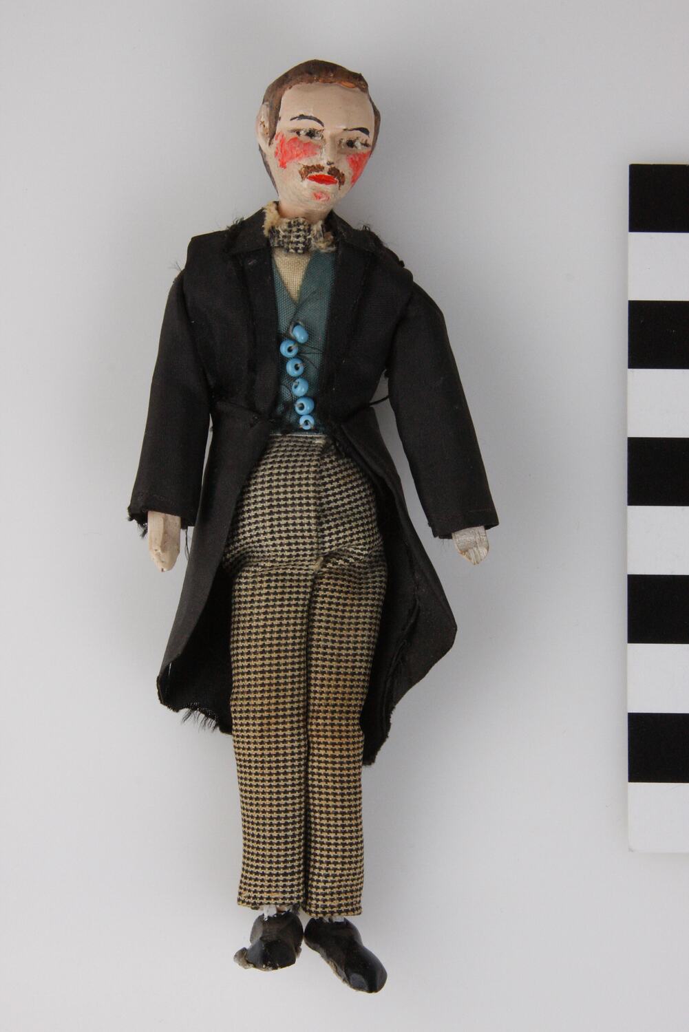 Handmade wooden male doll. Hand painted with articulated joints. Doll is wearing a black jacket with tails over a teal waistcoat with blue 'buttons' and cream shirt with check bow tie. He is wearing black and cream plaid trousers. The man has a moustache.