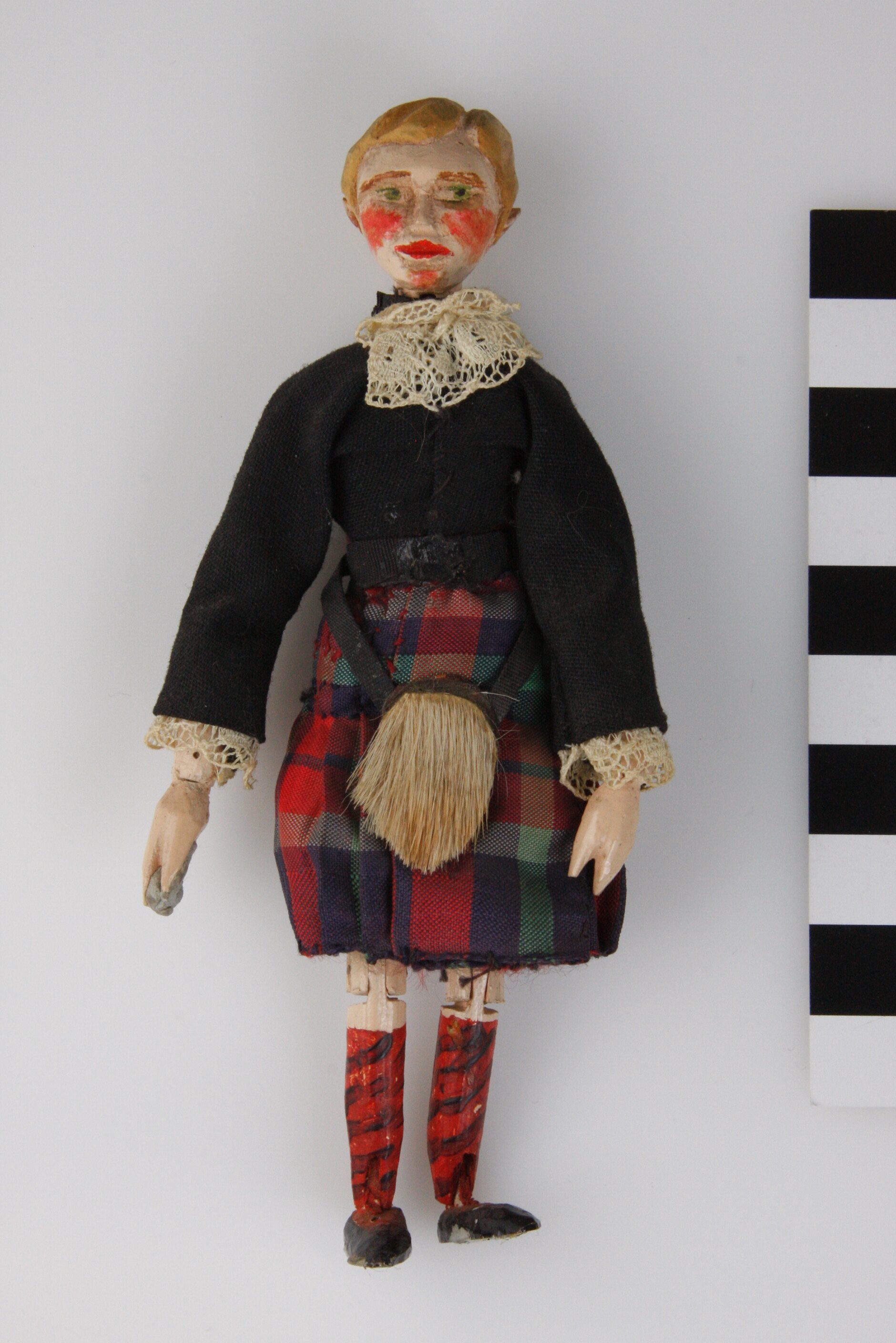 Handmade wooden male doll. Hand painted with articulated joints. Doll is wearing a black jacket and a tartan kilt.