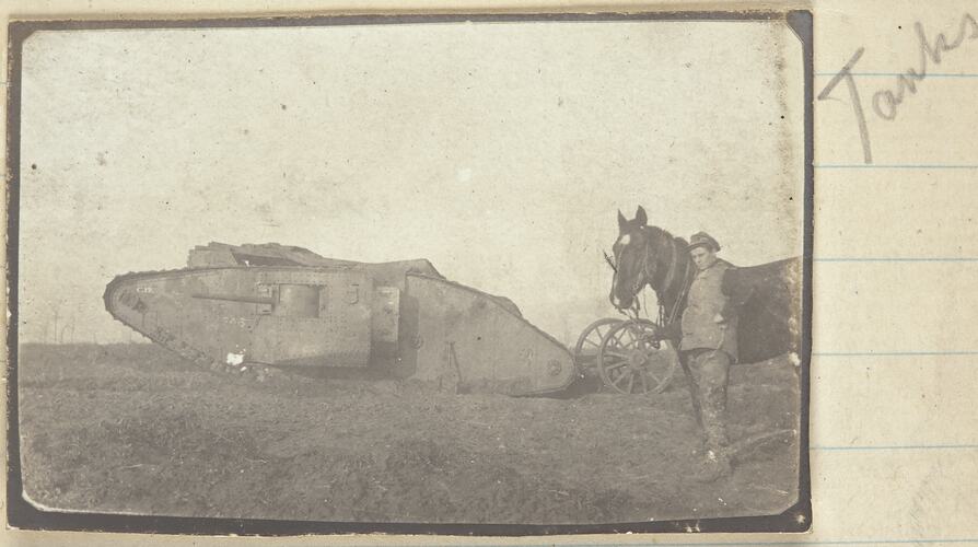 Photographs in the album depict army camps, hospitals, trenches, early tanks, landscapes, cemeteries and graves and groups of posed Australian soldiers. The places Lord mentions in his captions are La Boiselle, Quarry Siding, Pozieres, Albert, Bapaume and Favreuil.