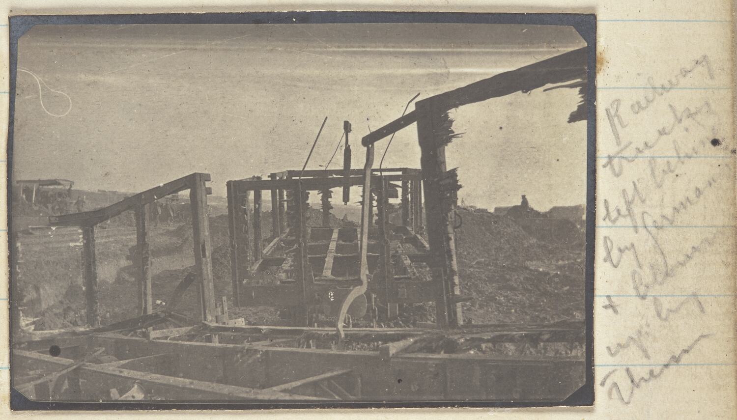 Hand-written in pencil on the secondary support on the left side of the photograph: ' 711'. Hand-written in pencil on the secondary support on the right side of the photograph: 'Railway / trucks / left behind / by Germans / + blown / up by / them'.