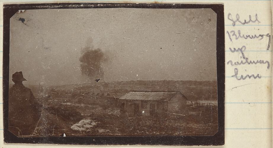 Hand-written on secondary support left side of photo: '720' Hand-written on secondary support right side of photo: 'Shell / Blowing / up / railway / line'