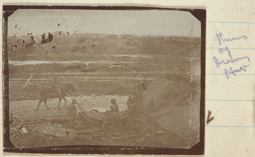Group of soldiers are surveying the debris of the destroyed dressing hut. To the right of the image there is a half destroyed courragted iron structure. In the left of the image there is a man on a horse walking past the ruins on what appears to be a flattened road. In the background tents and burnt out trees are visible. The landscape is muddy and wet with a number of large puddles.