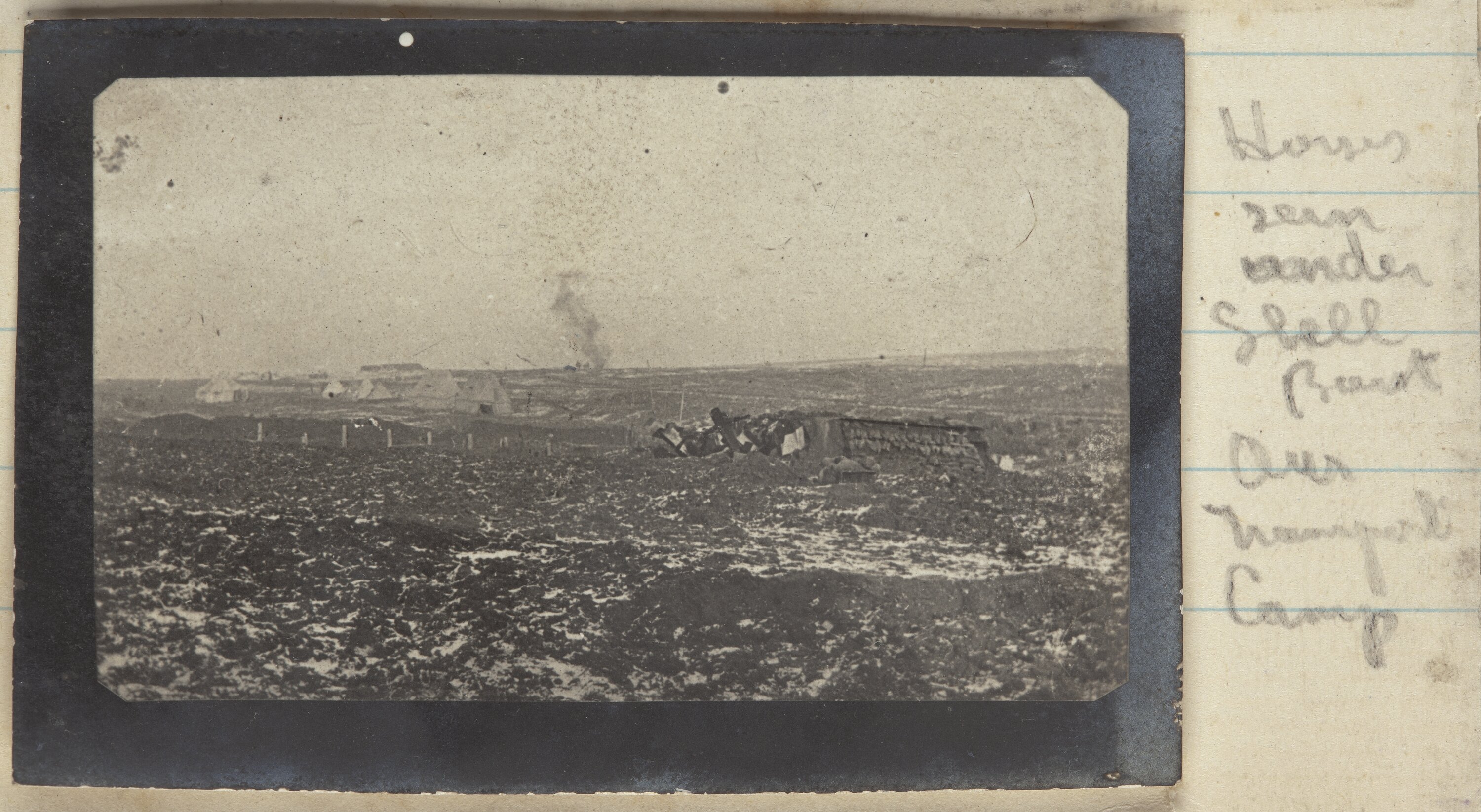 Hand written on secondary support on the left hand side of the image: '727' Hand written on secondary support of the right hand side of the image: 'Houses / seen / under / shell / blast / Our / ... [Illegible] / Camp '
