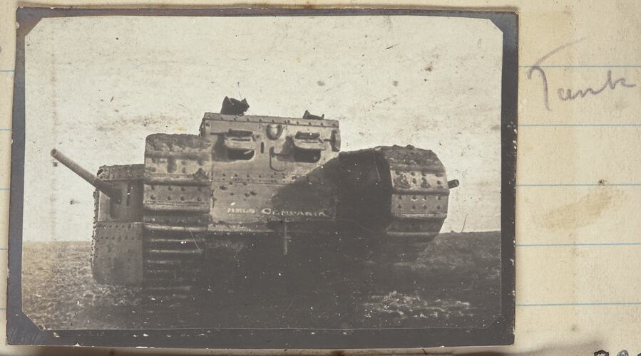 Photographs in the album depict army camps, hospitals, trenches, early tanks, landscapes, cemeteries and graves and groups of posed Australian soldiers. The places Lord mentions in his captions are La Boiselle, Quarry Siding, Pozieres, Albert, Bapaume and Favreuil.