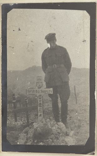 Soldier standing behind the grave of Pte H G Shapley The grave itself is marked with a white inscripted cross. A rising sun (Australian Army motif) is placed at the top of the cross. '13th Aust FA' has been inscribed on the base of the cross. A helmet is sitting on the grave infront of the cross. In the background other more simple wooden crosses can be seen.