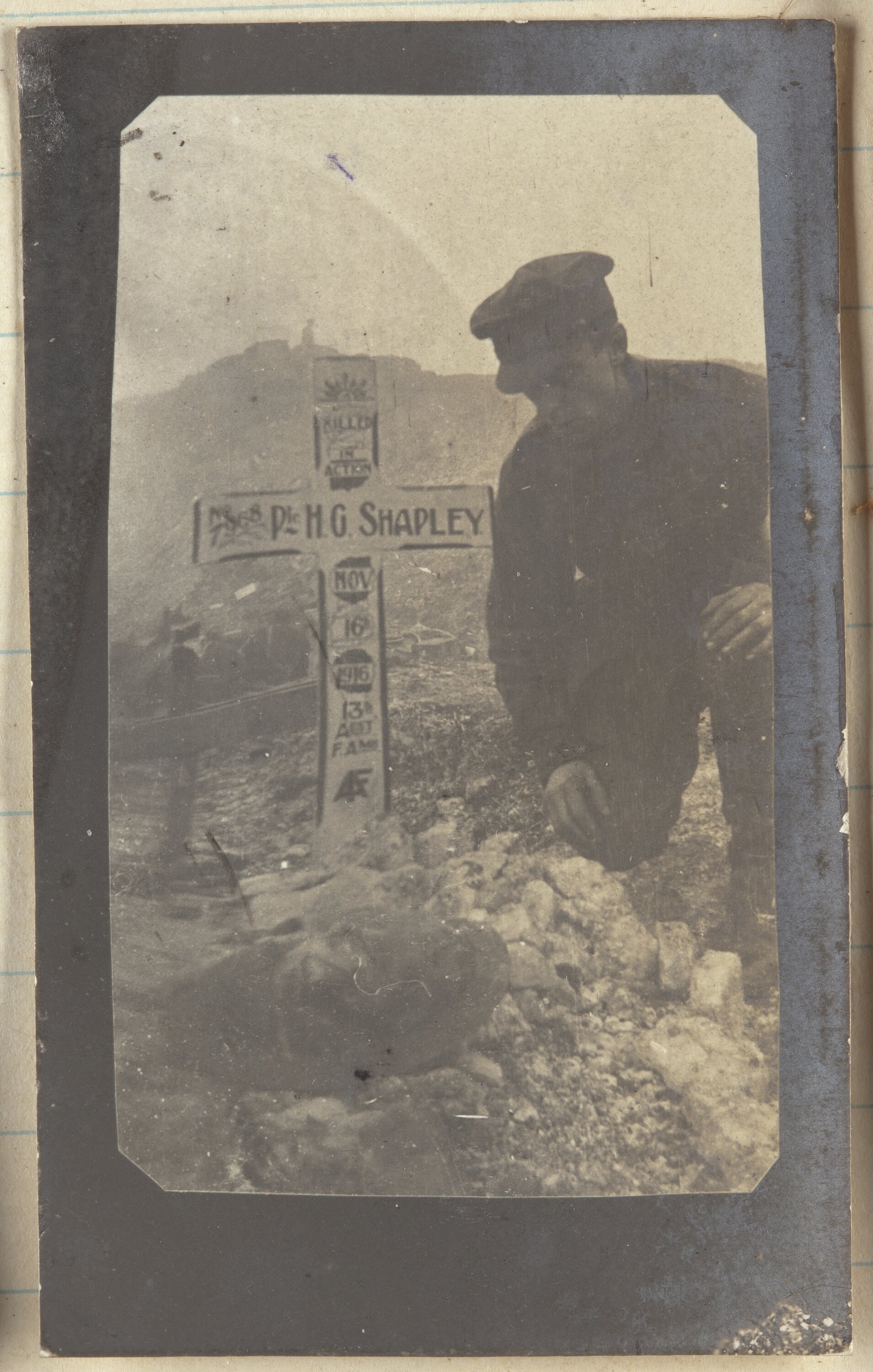 The same grave is photographed in MM 120182 and MM 120185. It was the grave of Private Harry Gilbert Shapley, service no.7968. He was killed in action on 17 November 1916, and was buried at Quarry Cemetery, '500 yards north of Montauban', France.