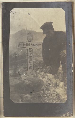 Soldier kneeling next to a grave. The grave is marked by a white cross and a pile of rocks. Inscribed in black on the white cross: '[image of rising sun] KILLED / IN / ACTION / NO 7968 Pte H. G. SHAPLEY / NOV / 16 / 1916 / 13th / AUS / F. AM / [illegible]' Another grave marker is visible in the background. Another soldier is seen walking in the background.