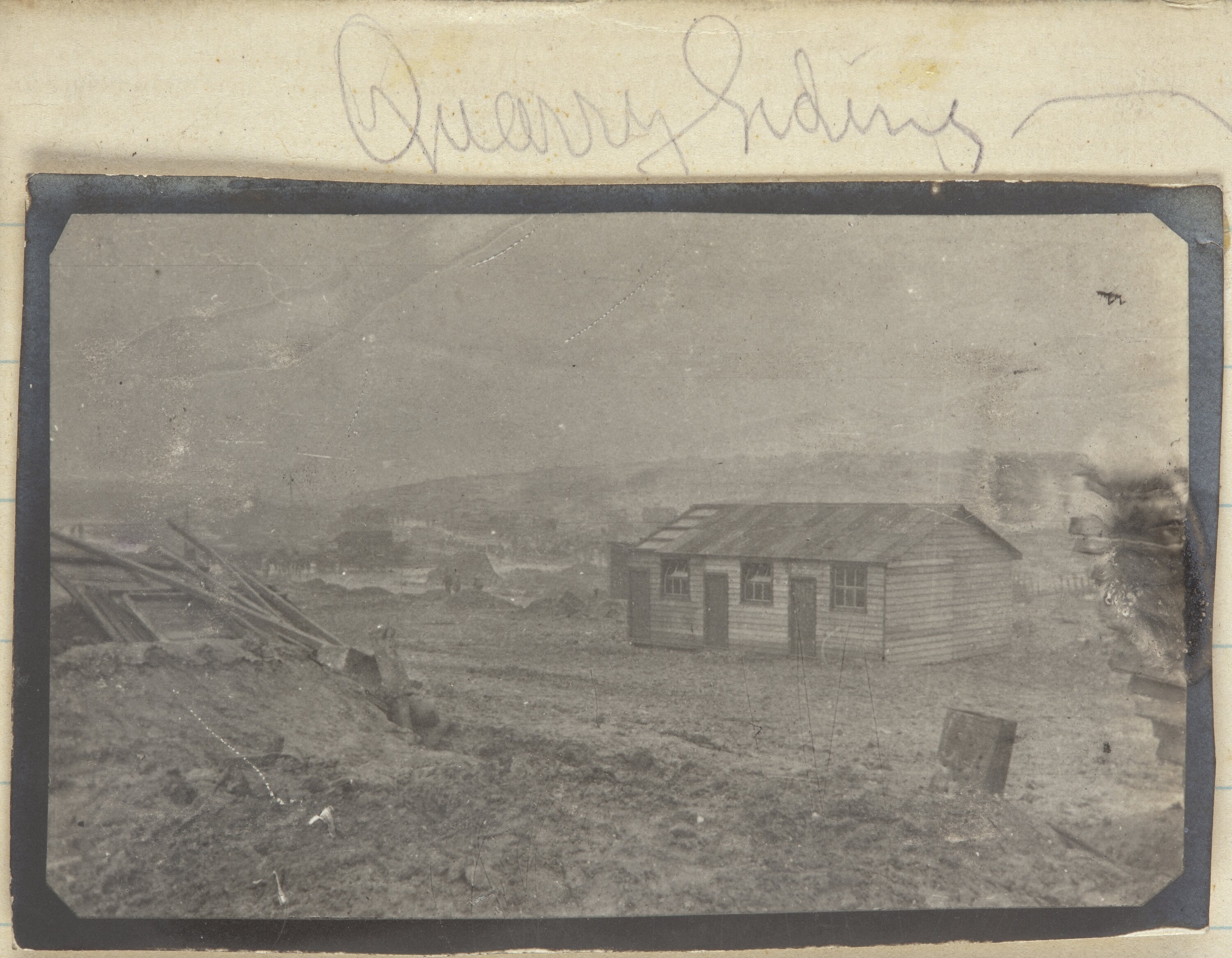 Quarry with wooden hut and debris in the foreground. Soldiers in the far background.