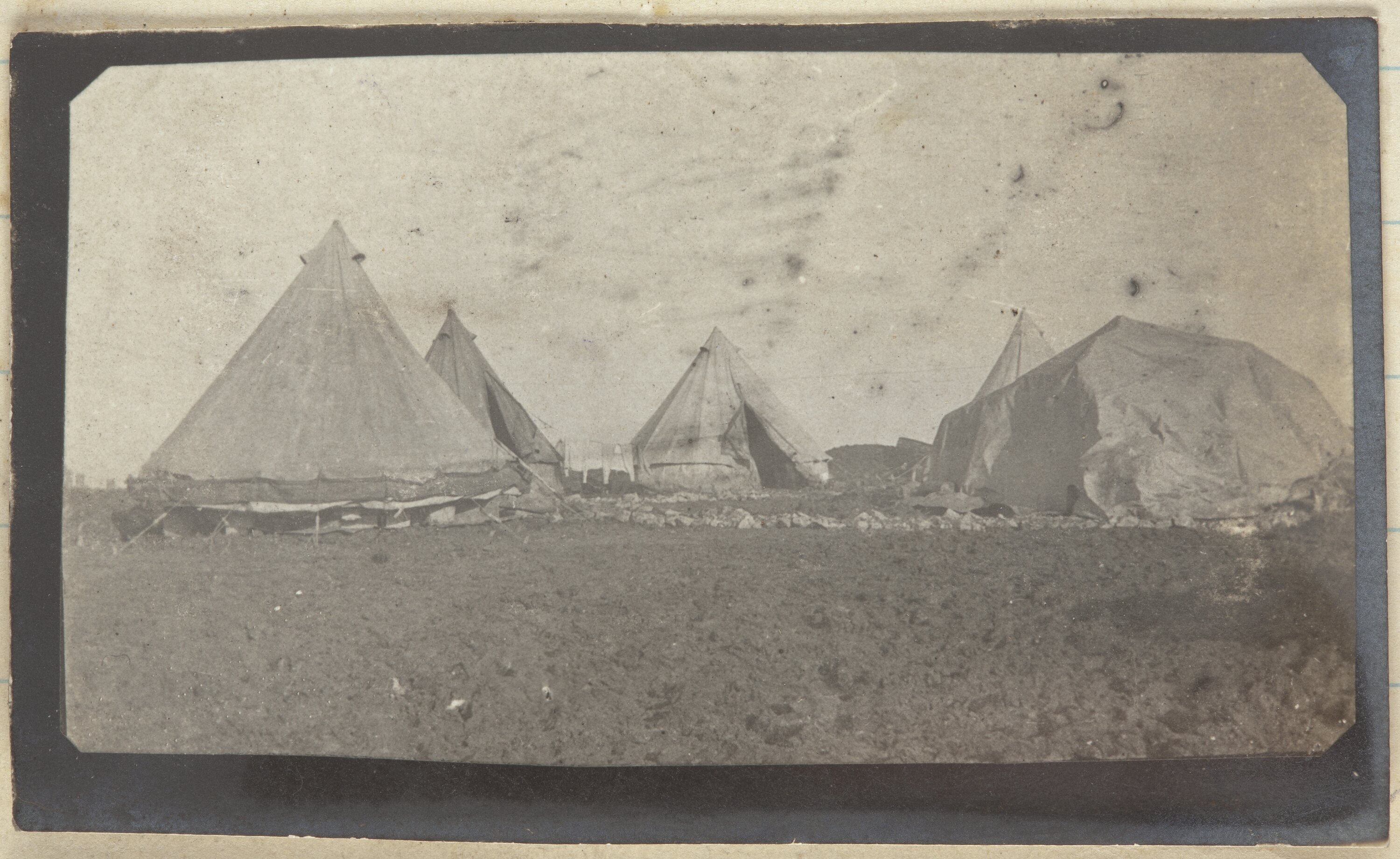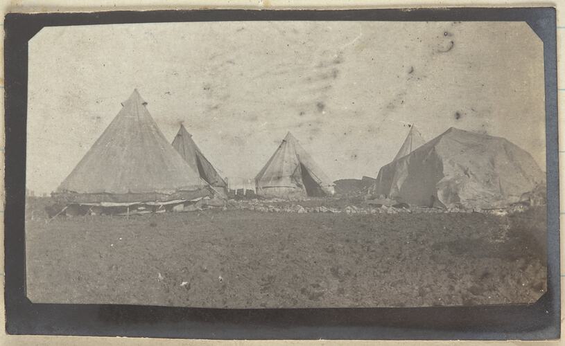 Photograph of army camp in a field. Four tents facing into one another. One mound of cloth covering something. Undergarments can be seen hung out to dry between two of the tents and to the left of the photograph.