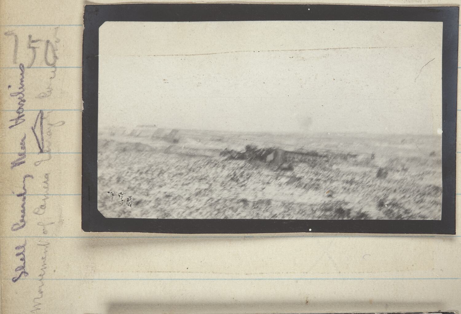 Hand written on the secondary support to the left hand side of the image: '750' Hand written, running vertical, on the secondary support to the left hand side of the image: 'Shell bursting Near ... [Illegible] / movement of ... [3 Illegible words]' Small 750 has been etched or printed on the image.