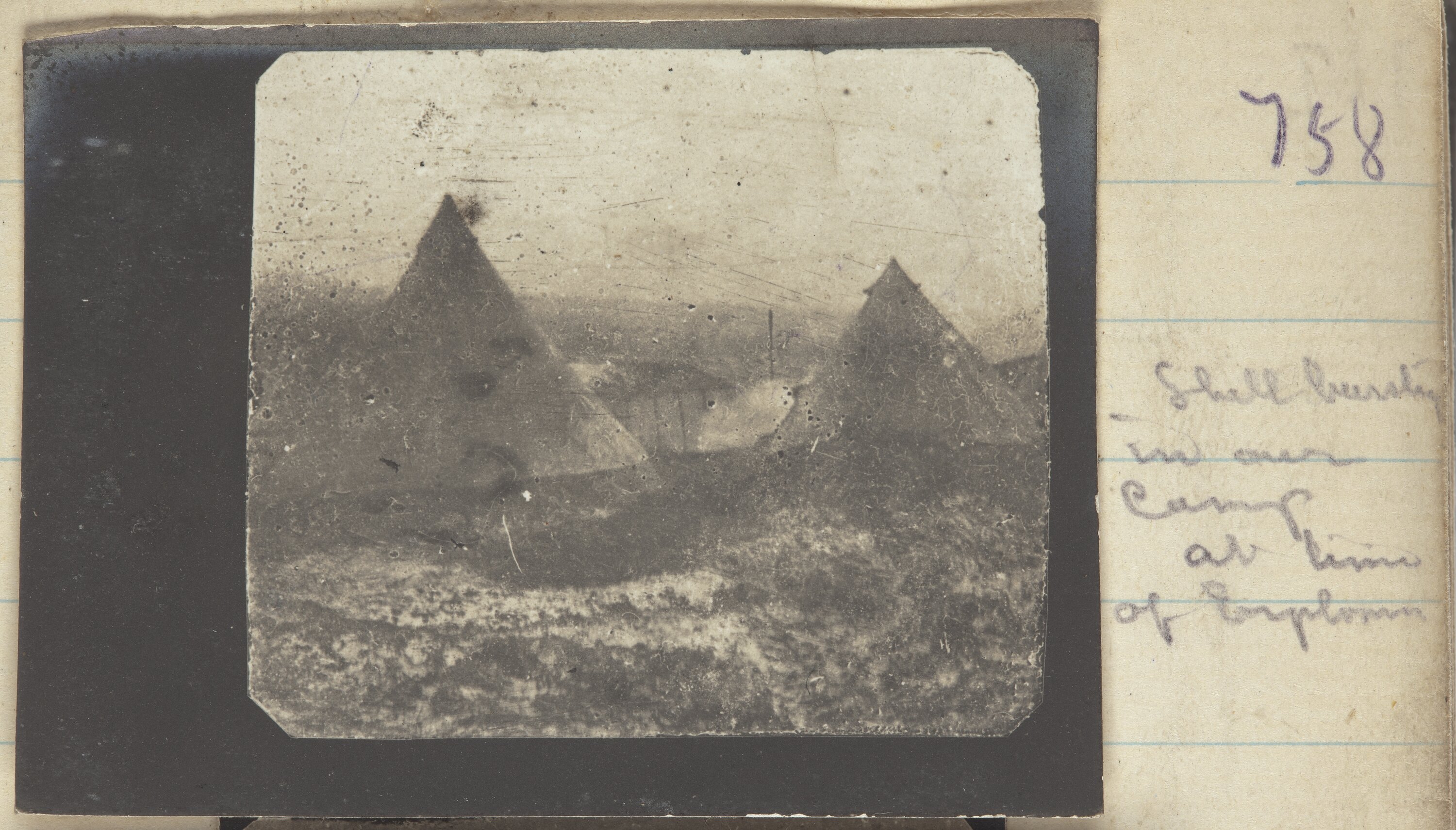 Hand-written on secondary support left side of photo: '' Hand-written on secondary support right side of photo: '758 / Shell bursting / in our / camp / at line / of [Illegible] '