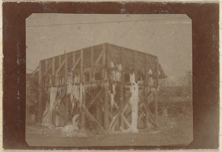 A large, partially destroyed wooden construction. There are a number of large icicles hanging from the building. Some other partially destroyed buildings and trees can be seen the background.