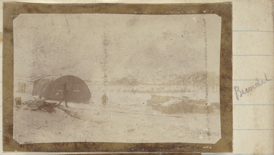 Debris in the foreground. Cylindrical hut with congregated iron roof and two soldiers and a supply dump with misc. crates in the middle portion of the photo. Snow covered field with trees in the background.