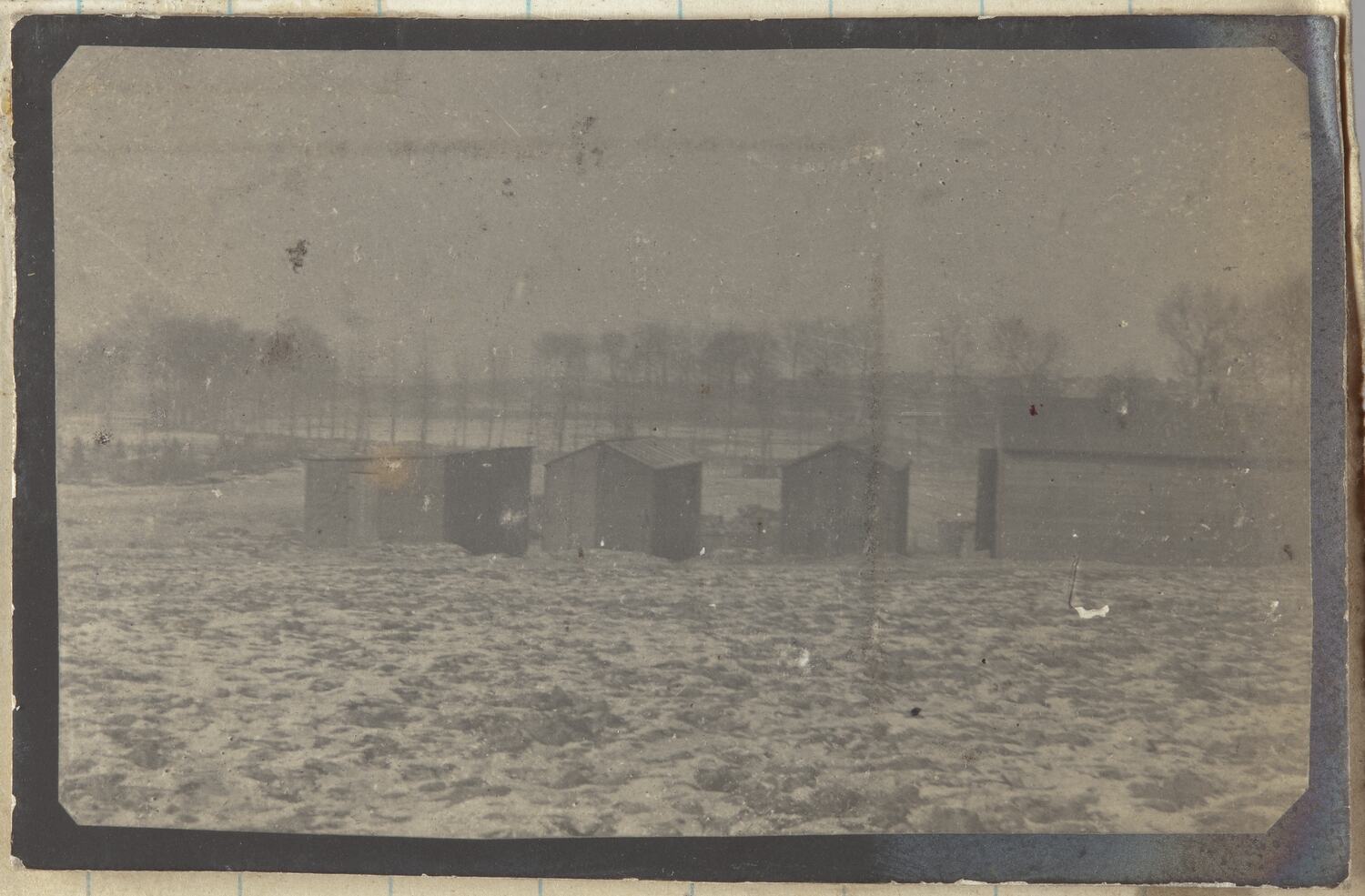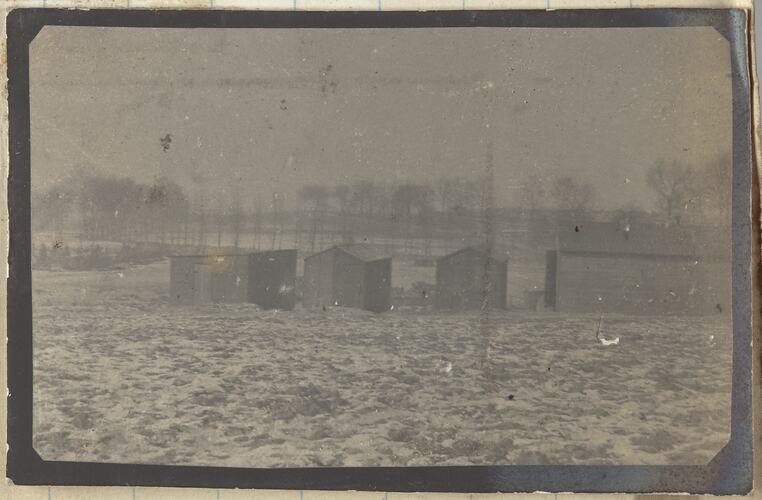 Photo of huts of the camp/dressing station in Bercordel Snow covered field in the foreground with huts in the middel potion of the photo. Dartmoor cementry in the background and a row of trees.