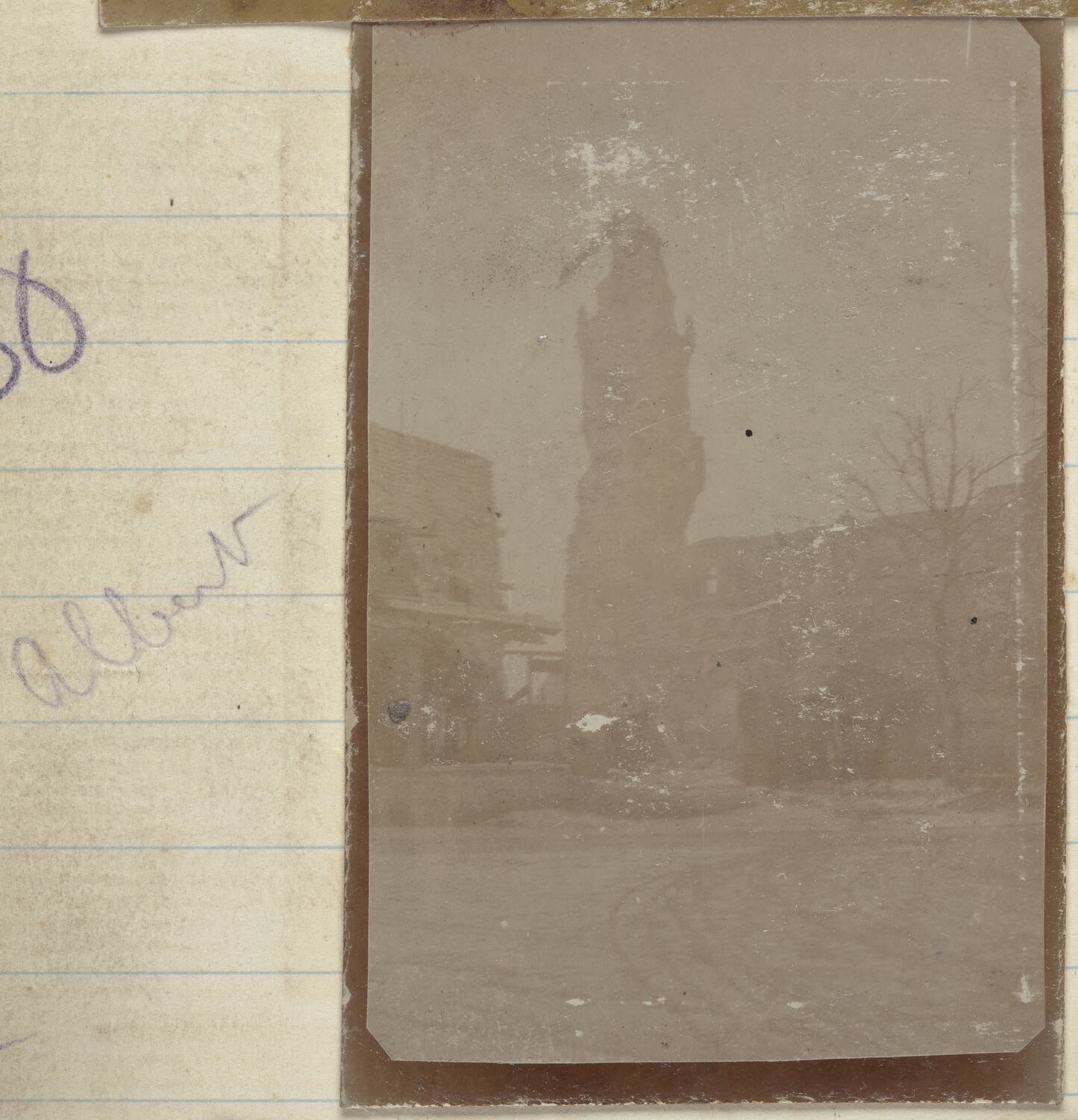 Photograph of partialy destroyed Basilica of Notre-Dame de Brebières in Albert. The fallen 'Golden Virgin' on top of the Basilica can be seen in the image. One of 185 black and white photographs in an album, taken in France during World War I by Sergeant John Lord. Some pages are blank.