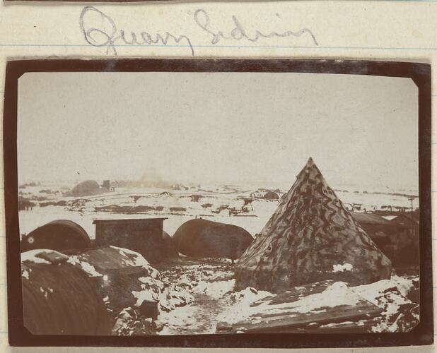 The image is of the Quarry site at Montauban covered in snow. There are a number of wooden huts and cylandrical corrugated iron sheds. There is a large tent in the foreground of the photograph.